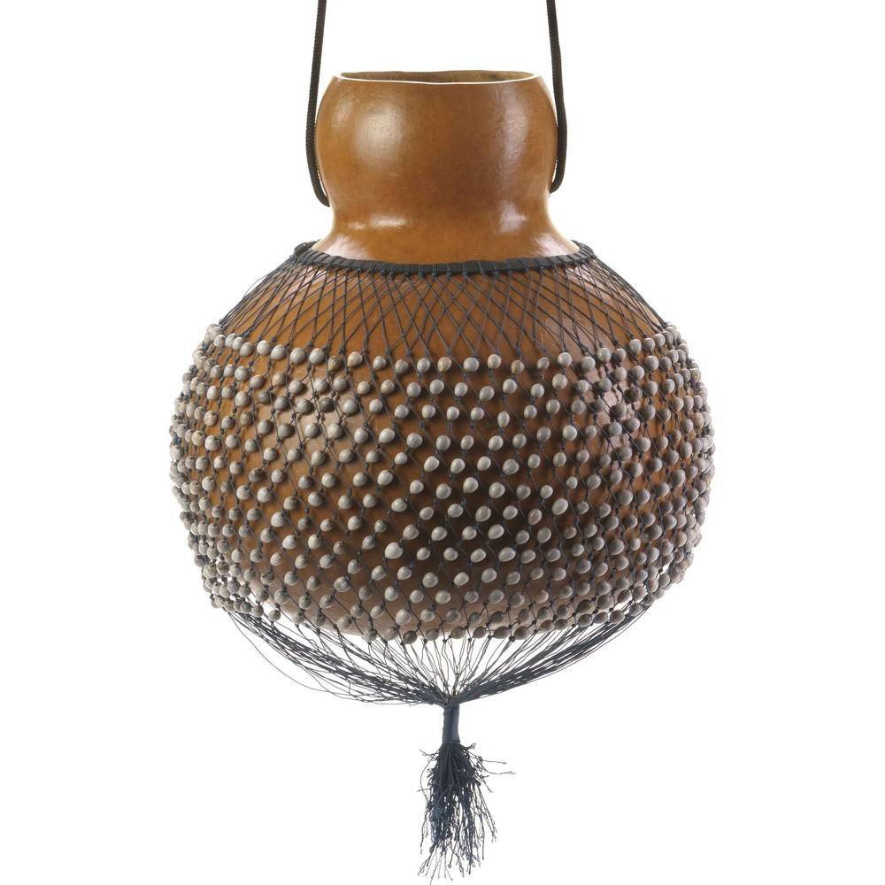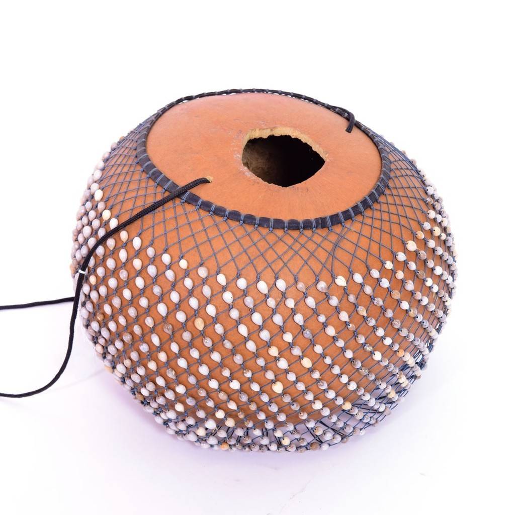Shaker uit Ghana gemaakt van een kalebas omringd door een net met zaden. Je hangt de kalebas om je nek, je tikt met je handen opzij tegen het netje. Door met de muis van je hand te stoten tegen de onderkant krijg je een bastoon.